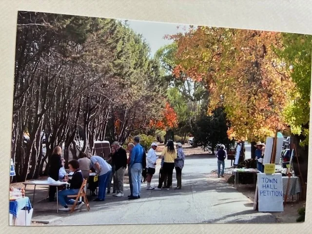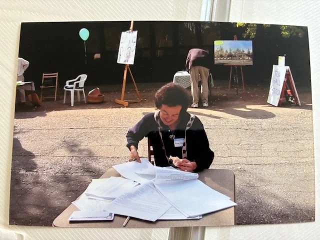Ms. Couperus, environmental advocate, outside Town Hall with signatures to preserve O’Keefe as an open space in perpetuity via the 2002 Open Space Initiative